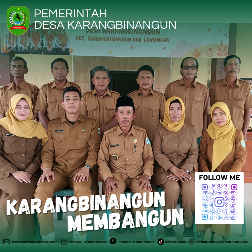 Saatnya mewujudkan pelayanan yang cepat, tanggap, responsive dan mudah bagi masyarakat Desa Karangbinangun !!! Kunjungi media sosial Pemerintah Desa Karangbinangun Tiktok : pemdeskarbin, Instagram : Pemdes _Karangbinangun, Facebook : Pemdes Karangbinangun, E-mail : karangbinangun93@gmail.com, Website Resmi Pemerintah Desa Karangbinangun